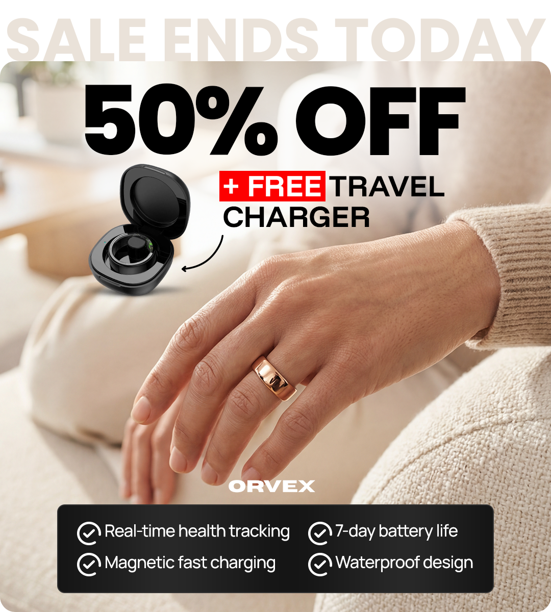 This is your final opportunity to purchase the Orvex Smart Ring at 50% OFF, and get a FREE Travel charger with every ring purchased!