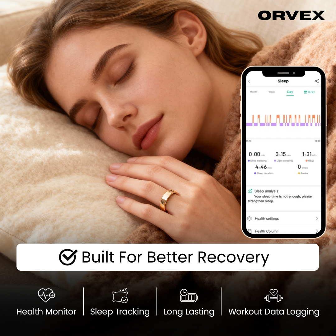 Orvex uses advanced sensors to monitor your heart rate, sleep patterns, activity, overall wellness, and more! All data syncs with the dedicated app for real-time insights.